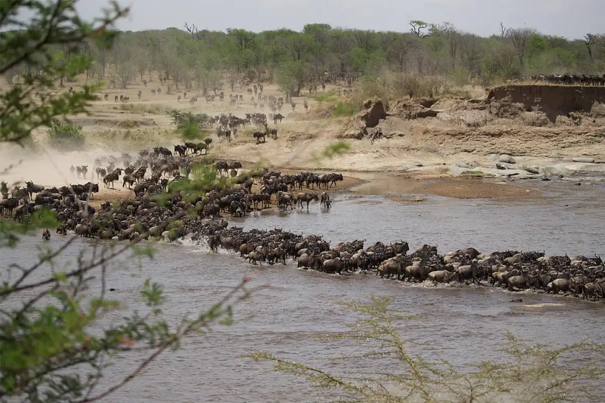 In the far north, the experience becomes more focused. The landscape draws itself toward the Mara River, where the great herds arrive and gather and wait. The sound of water moving over rock sits beneath everything, constant and steady. There are long moments of stillness and hesitation before sudden, explosive movement breaks through, and it's that tension as much as the crossings themselves that defines what you feel here.