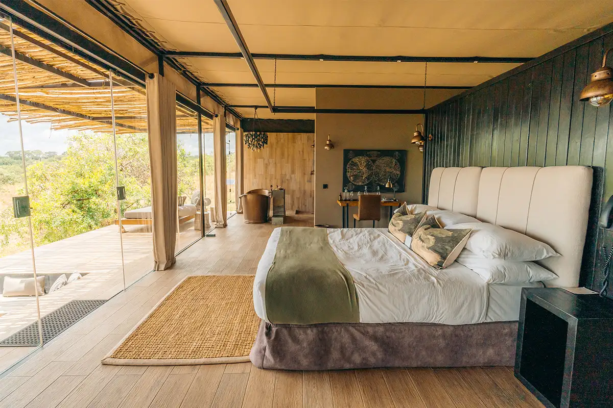 Further west, Nimali Serengeti elevates this design philosophy across the endless plains of the central Serengeti. The tented suites’ structured roofs soar high, combining glass walls with canvas panels that filter warm sunlight and facilitate airflow. This architectural layering creates intimate, light-filled spaces that invite the vast migration landscape inside, while the canvas walls provide soft, natural textures that maintain a sense of enclosure without obstructing views.